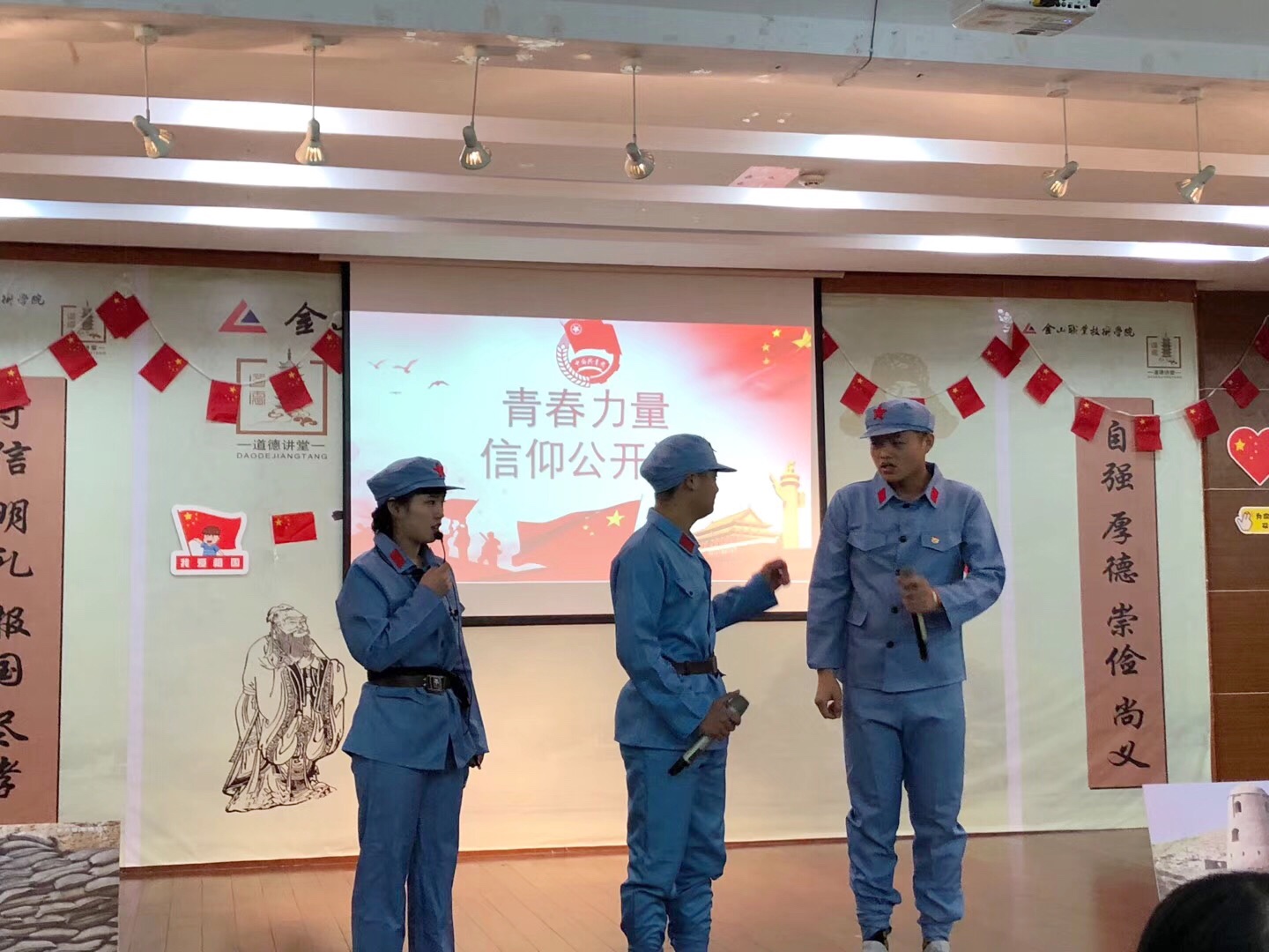课程开始,团委宣传部部长鞠梦婷领学🏥,带大家回顾了新中国70年来的发展历史;三位同学分享了自己的青春故事,用自己的故事激励在场的每一位同学保持初心🧟♂️,挥洒青春和热血👆🏿,为学校、为社会🎎、为国家贡献自己的力量;演绎《尖刀班》情景剧的同学们,他们身穿红军服装🕵🏼💇🏽♀️,向大家重现了80多年前先辈英烈的革命精神,提醒同学们,在生活安逸和平的今天,作为新时代的大学生仍然要继承革命先烈的遗志。