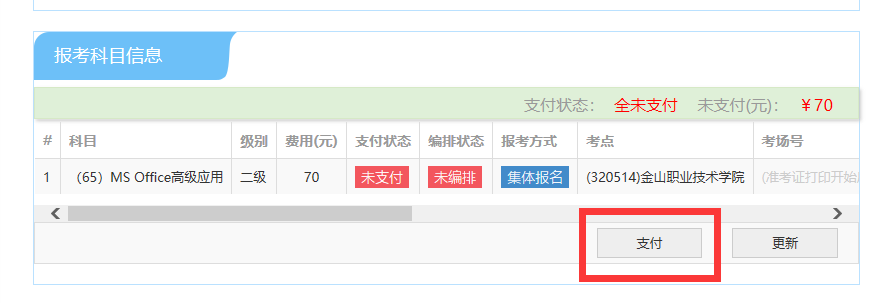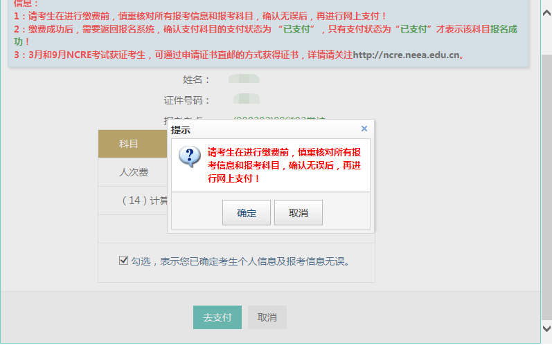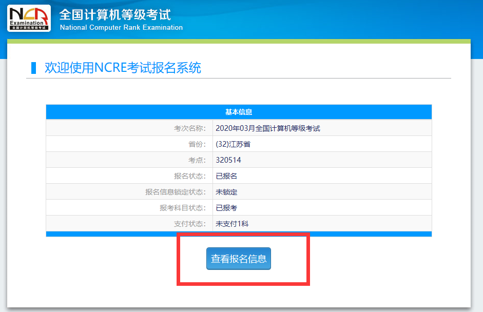 4.查看个人信息 密码修改完毕后,显示该界面⛳️。点击右下角“全国计算机等级考试(全国版)”,输入最新密码,进入考生界面,查询自己的报考信息是否正确、完整🧑💻。 注意:若个人信息有误🙌🏿、照片不清楚,请到教务处修改。 5.进行缴费 若信息核对无误,点击“支付”按钮进行缴费💶。 注意💿: 1.在缴费前一定要核对自己的个人信息🙅🏼♀️、照片、报考科目是否正确,一旦缴费成功,信息将无法更改。 2.考生全部采用个人网上缴费方式☝️🫓,须在规定时间内登陆系统进行缴费(1月6日12点前)。 3.考生报名过程中,如有问题,请及时联系:0511-88020275(教务处) 13062910546(王碧晖) 彩神教务处 二〇一九年十二月十九日