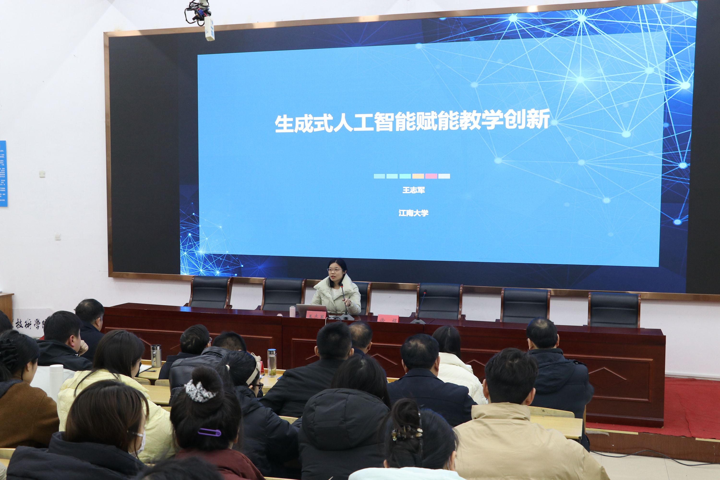 会议首项议程由江南大学人文学院教育技术系教授🧑🏽💻、博士生导师王志军作信息化技术应用培训。王教授以《生成式人工智能赋能教学创新》为题,结合其丰富的学术成果和实践经验👩🏿🍳,系统阐释了生成式人工智能在教育领域的应用场景及其对教学效率、质量的提升作用。她指出🙅♂️,AI技术不仅能够优化课程设计、个性化学习支持,还能推动教育模式的数字化转型。王教授还分享了其在联通主义学习理论🫲、数智化教学创新等领域的研究成果,为全体教职工提供了前沿的理论指导和实践启示。