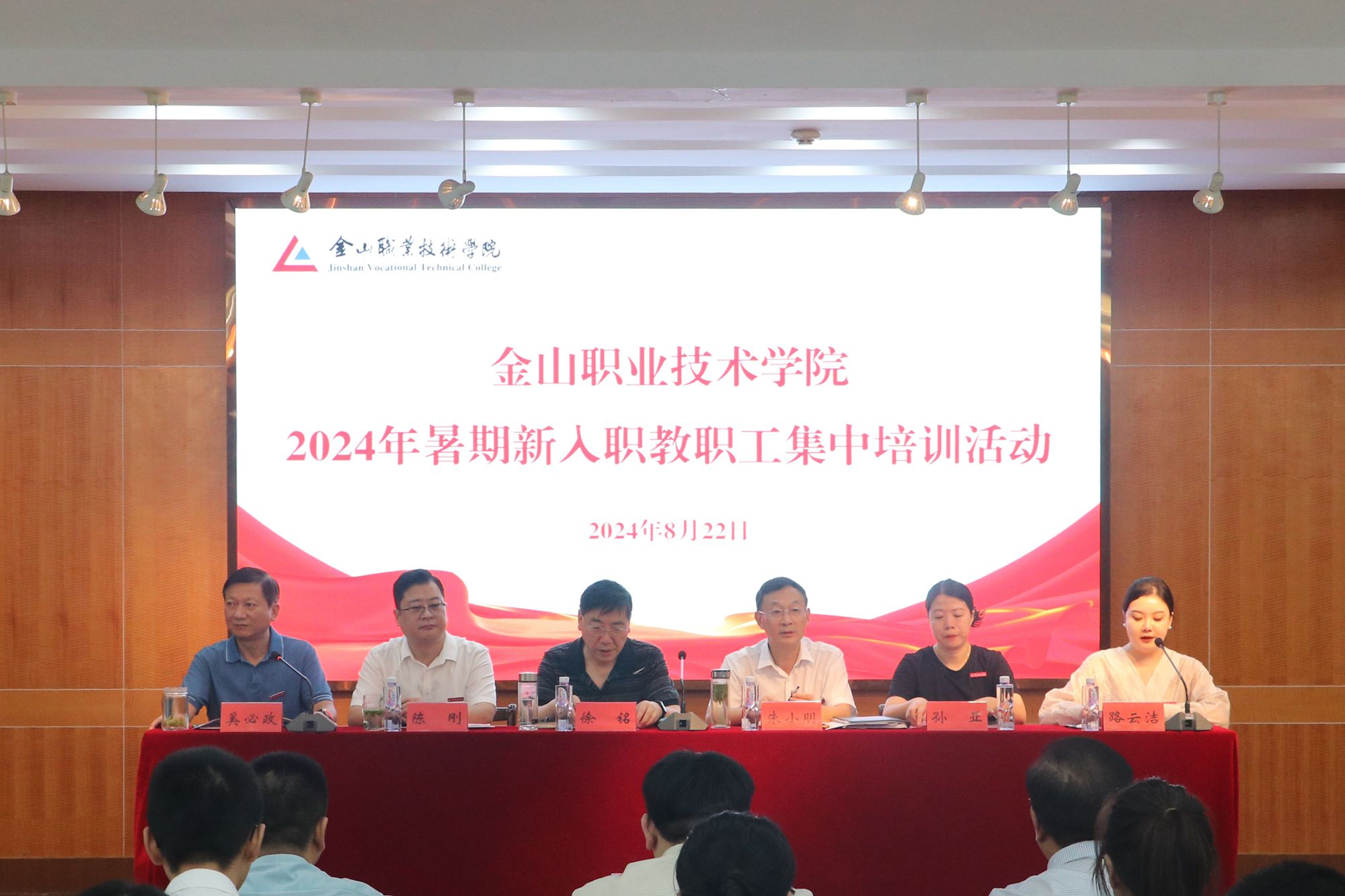 学院党委书记徐铭,执行院长朱小明🦹🏼♀️,副院长陈刚🙍♀️🤸🏻♂️、孙亚、奚必政,师徒结对导师以及全体新入职教职工参加培训活动。活动由人事处处长路云洁主持。