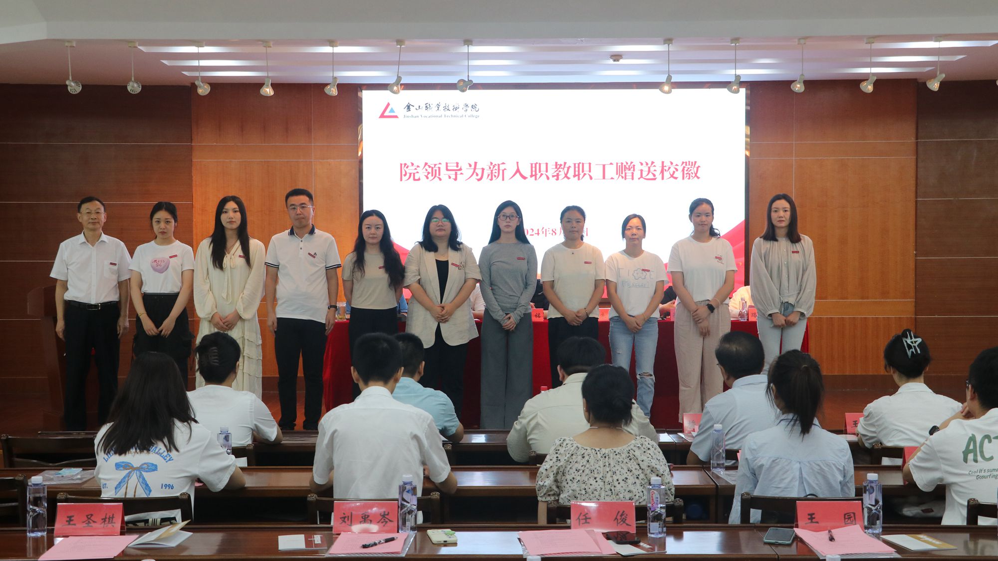 朱小明为新入职教职工赠送校徽🌥。