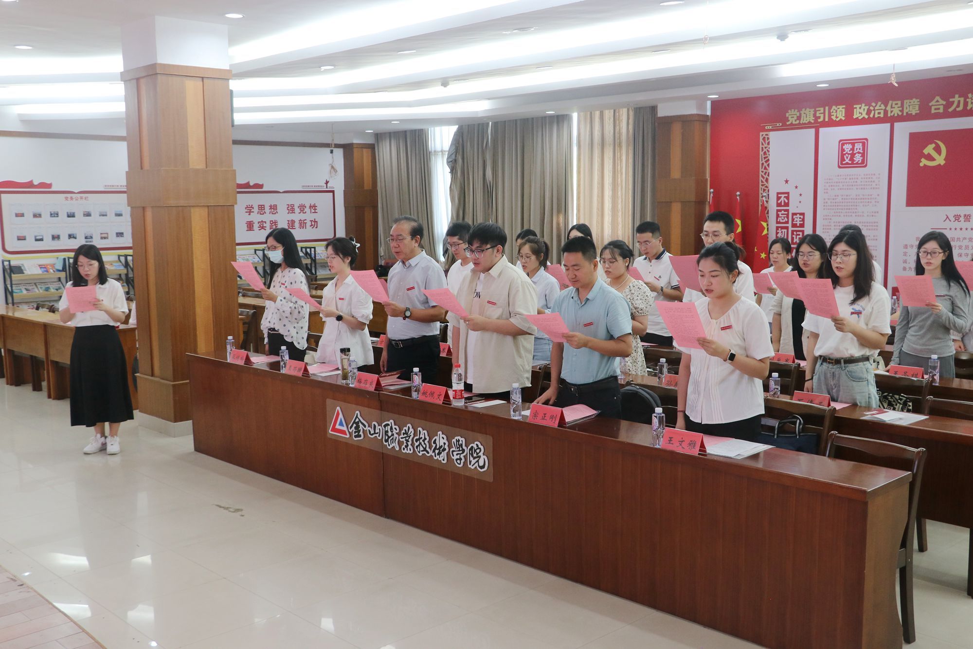 江苏高校“青蓝工程”优秀青年骨干教师培养对象、镇江市“169工程”学术技术新秀培养对象👩🏼💼👐、江苏省高职院校青年教师企业实践项目培养对象🕊、机电与交通系电气教研室主任朱艳带领新入职教职工集体宣读《新时代高校教师职业行为十项准则》。
