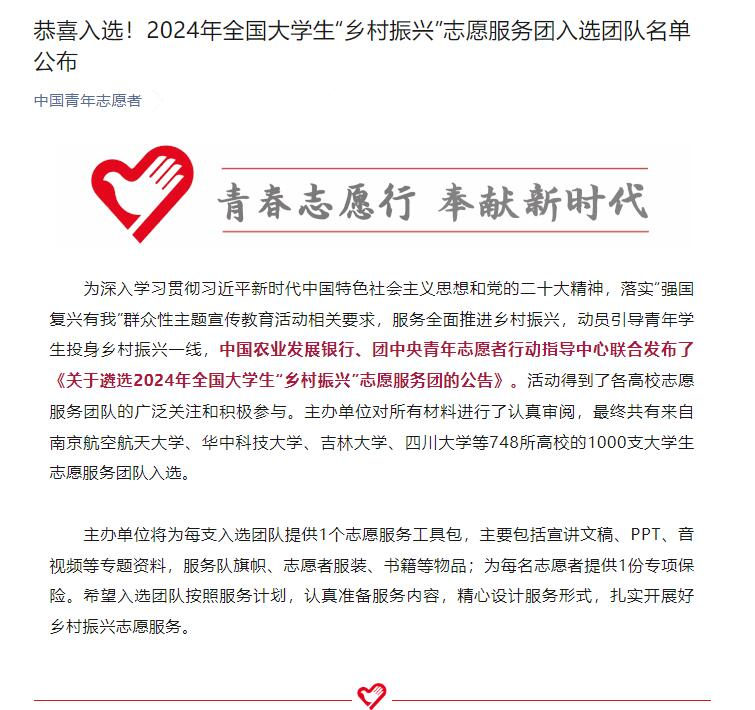 为深入学习贯彻习近平新时代中国特色社会主义思想和党的二十大精神,服务全面推进乡村振兴,动员引导青年学生投身乡村振兴一线,中国农业发展银行、团中央青年志愿者行动指导中心联合发布了《关于遴选2024年全国大学生“乡村振兴”志愿服务团的公告》,我院圆梦志愿支教队成功入选🆕!