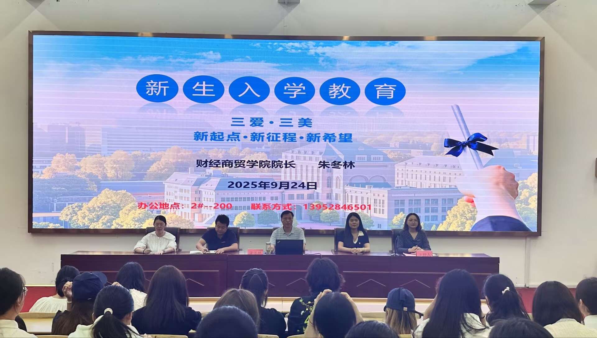 金风送爽迎萌新,丹桂飘香启新篇。9月24日,财经商贸学院2025级新生入学教育活动在金山学堂举行。学院院长朱冬林👩🦳、教学秘书张敏⛓️💥、商贸教研室主任袁杰🥛、大数据与会计教研室主任朱婉莹💇♂️🧐,全体辅导员及2025级全体新生齐聚一堂,共同开启新生大学生涯的第一课。