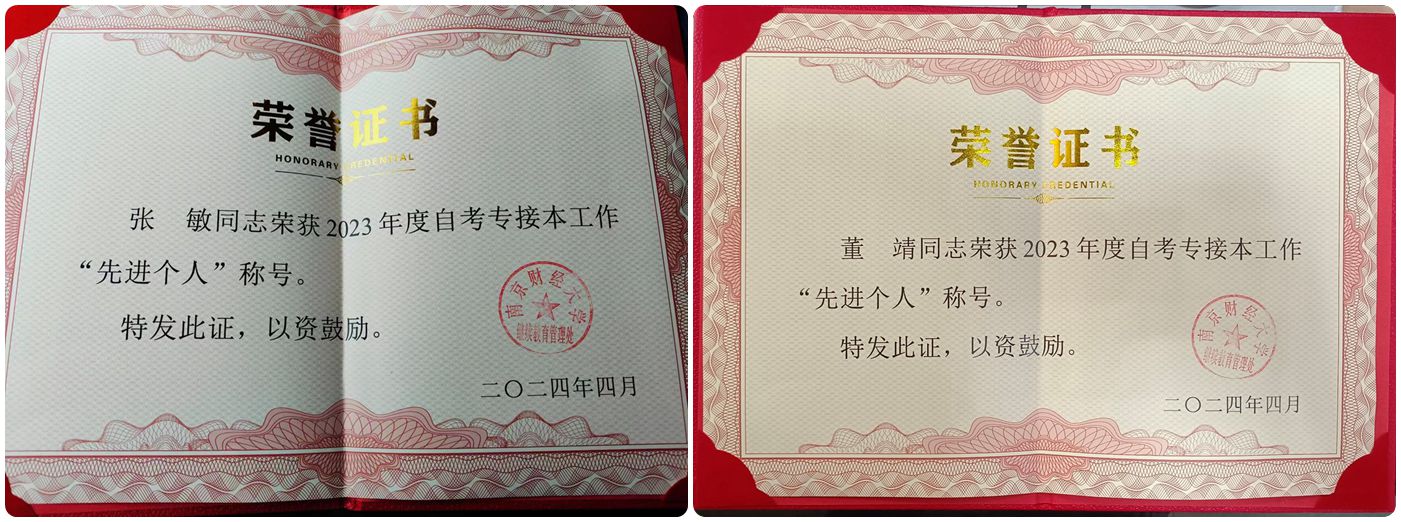 2024年4月11日🧘🏽♂️,南京财经大学召开2024年自学考试“专接本”工作会议🟪,会上🍦,表彰了2023年度自考“专接本”工作“先进集体”和“先进个人”👨🏻🦼➡️。我院荣获南京财经大学自学考试“专接本”工作“先进集体”🤘,经济与贸易系张敏老师😵💫、本科教育管理部董靖老师荣获“先进个人”称号🏄🏽。