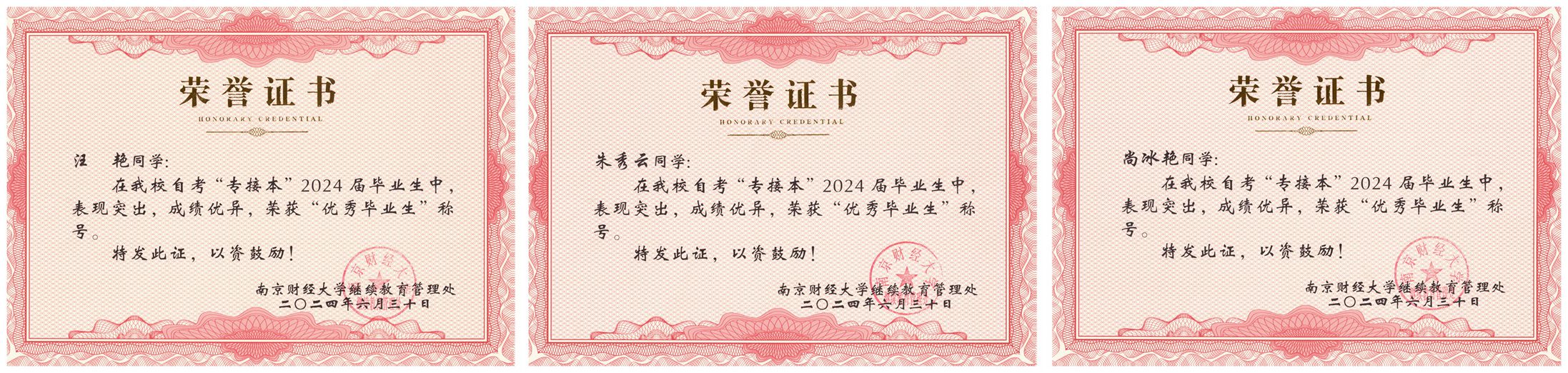 我院3名学生荣获南京财经大学自考“专接本”2024届优秀毕业生称号