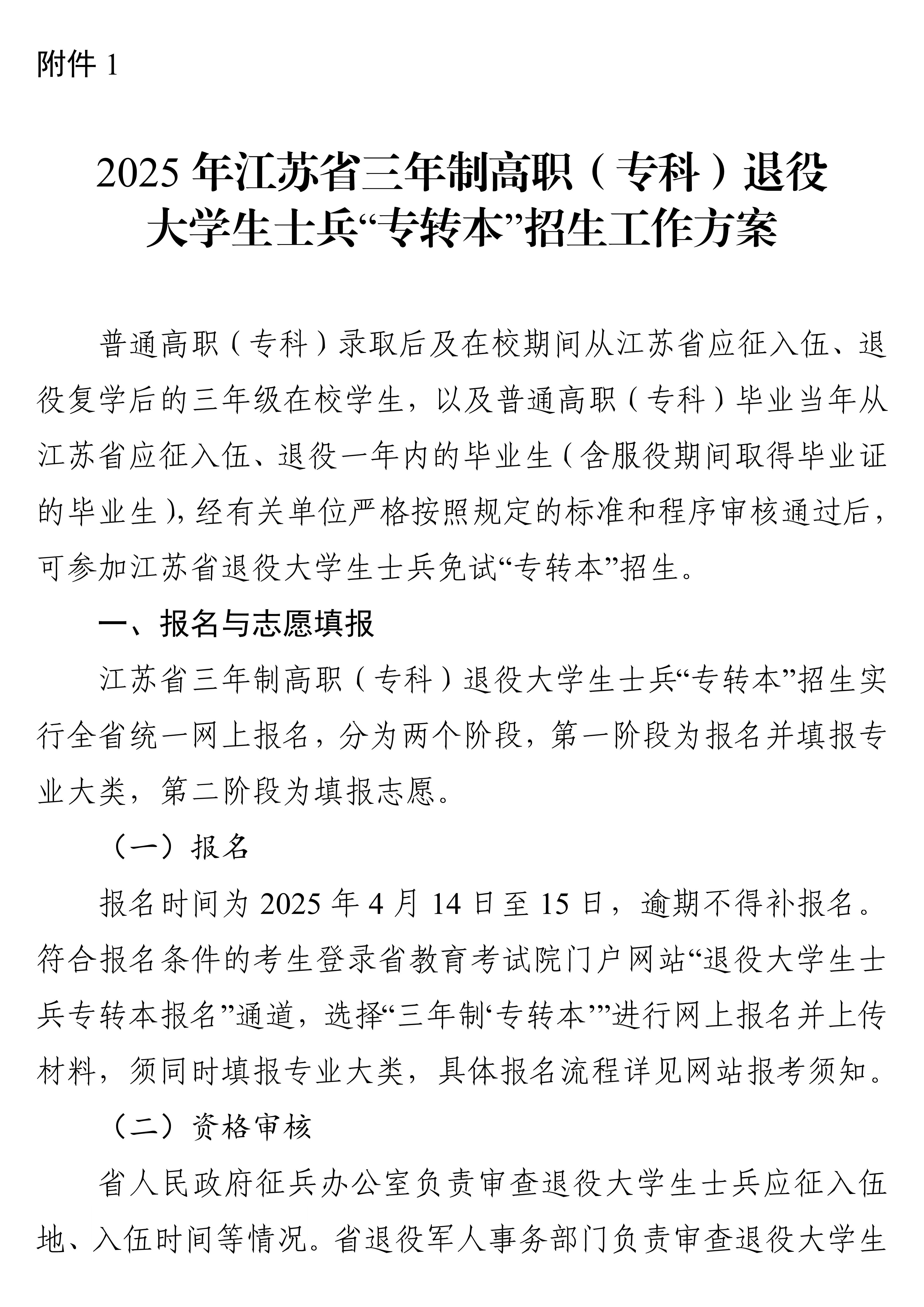2025年江苏省三年制高职(专科)退役大学生士兵“专转本“招生工作方案