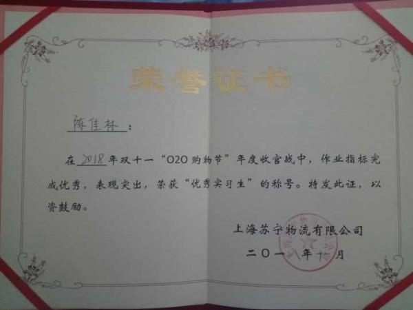 机电与交通系实习生喜获上海苏宁物流优秀员工称号