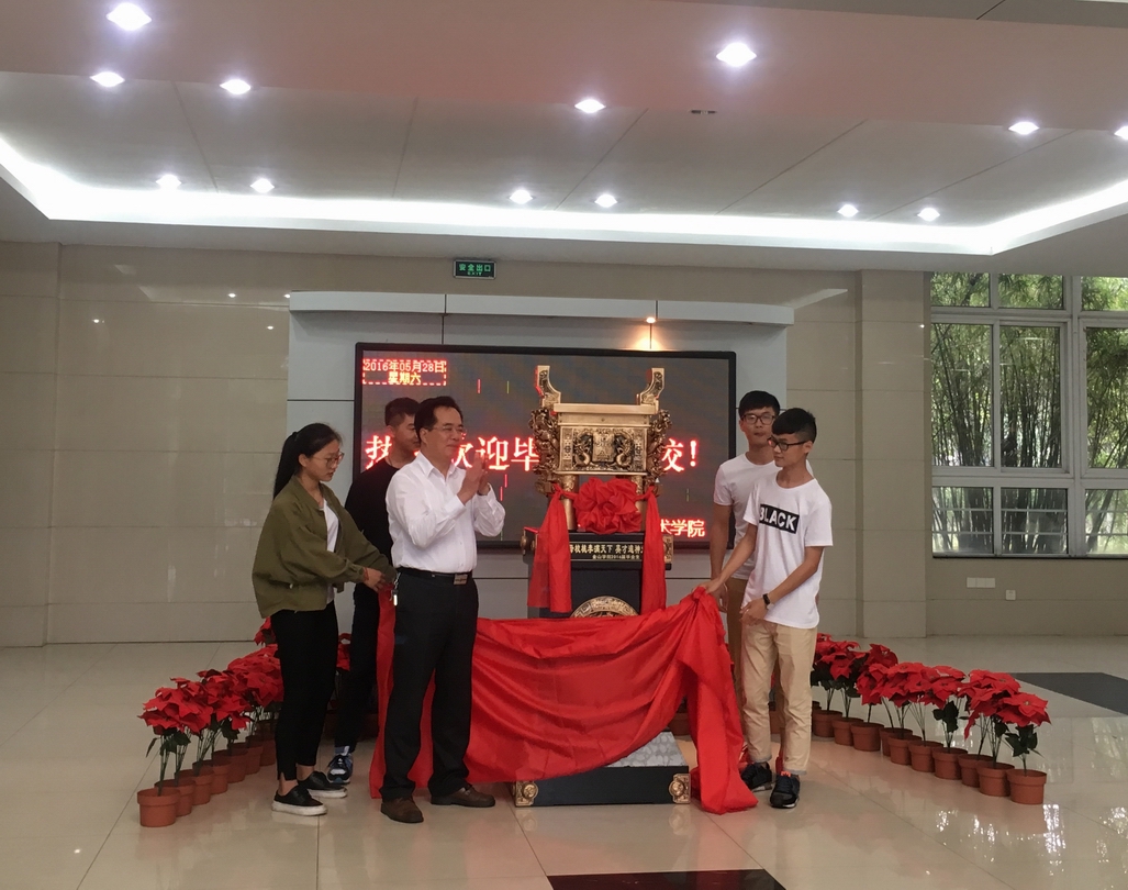 深情别师长🧗♀️,情思留校园🤸🏻♂️。5月28日下午1:00👳🏻♀️,学院2016届毕业生“饮水思源,情系母校”捐赠仪式在图书馆一楼大厅隆重举行🍂。学院党委书记孙维浒、学院院长骆志高🕥、学院副院长王慧萍和副院长刘干出席了捐赠仪式,2016届毕业生及团学组织学生参加了仪式。 在主持人慷慨激昂的陈词中,仪式拉开了序幕🏯。伴着激动人心的音乐🙆🏻♀️,学院孙书记和2016届毕业生代表周红康、孙宇珊、候雪雨、王智健等四位同学共同为捐赠的纪念品揭幕👨🏼🔧。随着一席红布的落地🚴,一尊气势不凡的“千秋鼎盛”大鼎映入了大家的眼帘🧑🏿⚕️。这尊大鼎表达着毕业生们对母校的感激之情,也表达着他们希望母校继往开来🫛🌙、再创辉煌的祝福。随后🚮,学院孙书记和四位毕业生代表逐一握手并合影留念,孙书记代表学院送去了母校对他们的感谢和祝福📜。 仪式在大家热烈的掌声中宣告结束👆🏿。“一路感恩👩🏿🦱🤛🏽,一路前行”, 金山学院的毕业生们将怀揣自己的梦想和母校对他们的希冀奔向社会,向着美好的未来努力奋斗。(学工 任凤娇)