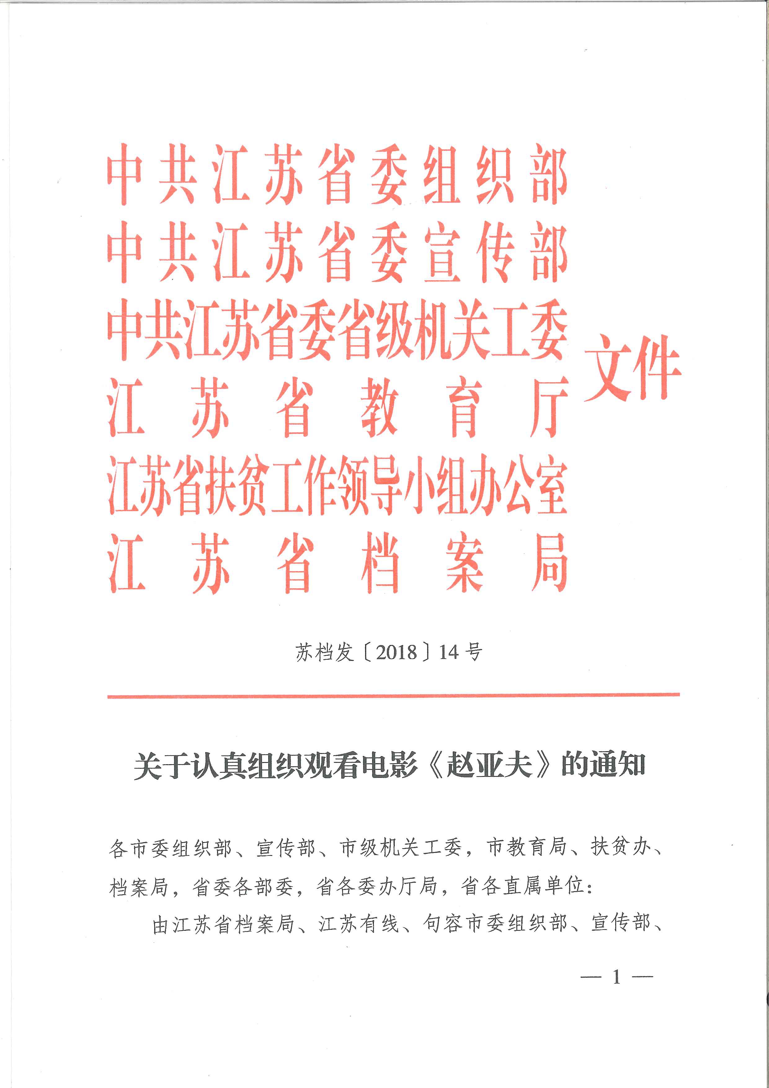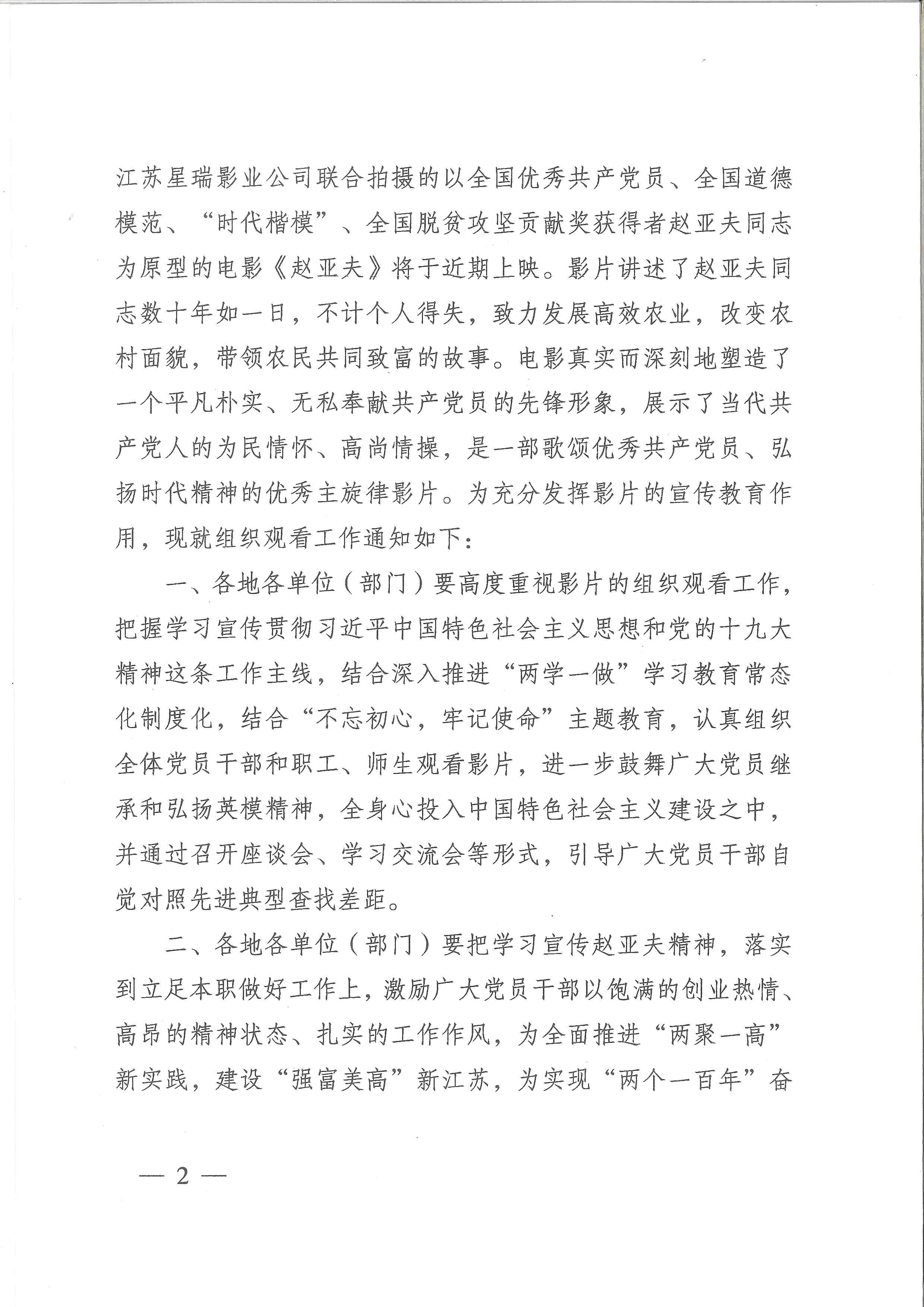 关于认真组织观看电影《赵亚夫》的通知