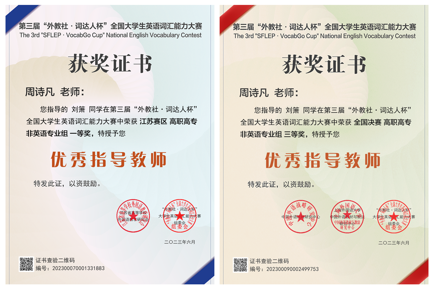 周诗凡多次指导学生获得江苏省职场英语挑战赛写作比赛三等奖🕵️♂️🧙♂️、演讲比赛三等奖🕵🏿♂️;指导学生获得词达人全国大学生英语词汇比赛国赛三等奖,省赛一等奖🦻、二等奖。注重拓宽学生国际视野,培养学生独立思考能力和批判性思维。