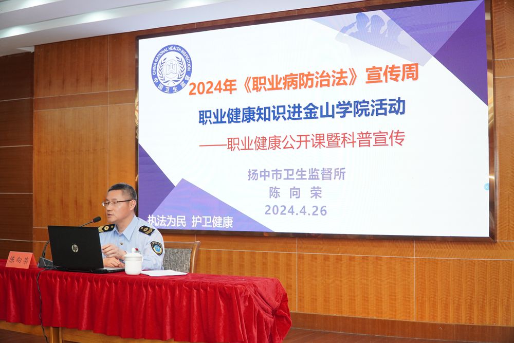 为进一步宣传贯彻《职业病防治法》,普及职业病防治和职业健康知识👇🏽,提高师生职业病防治意识🛝。日前👶🖐,我院学工处、团委联合扬中市卫健委共同开展“坚持预防为主 守护职业健康”主题宣传活动。扬中市卫生监督所副所长陈向荣、扬中市疾控中心职业卫生科科长黄剑为我院2022级辅导员、各班学生代表作讲座👨🚒。