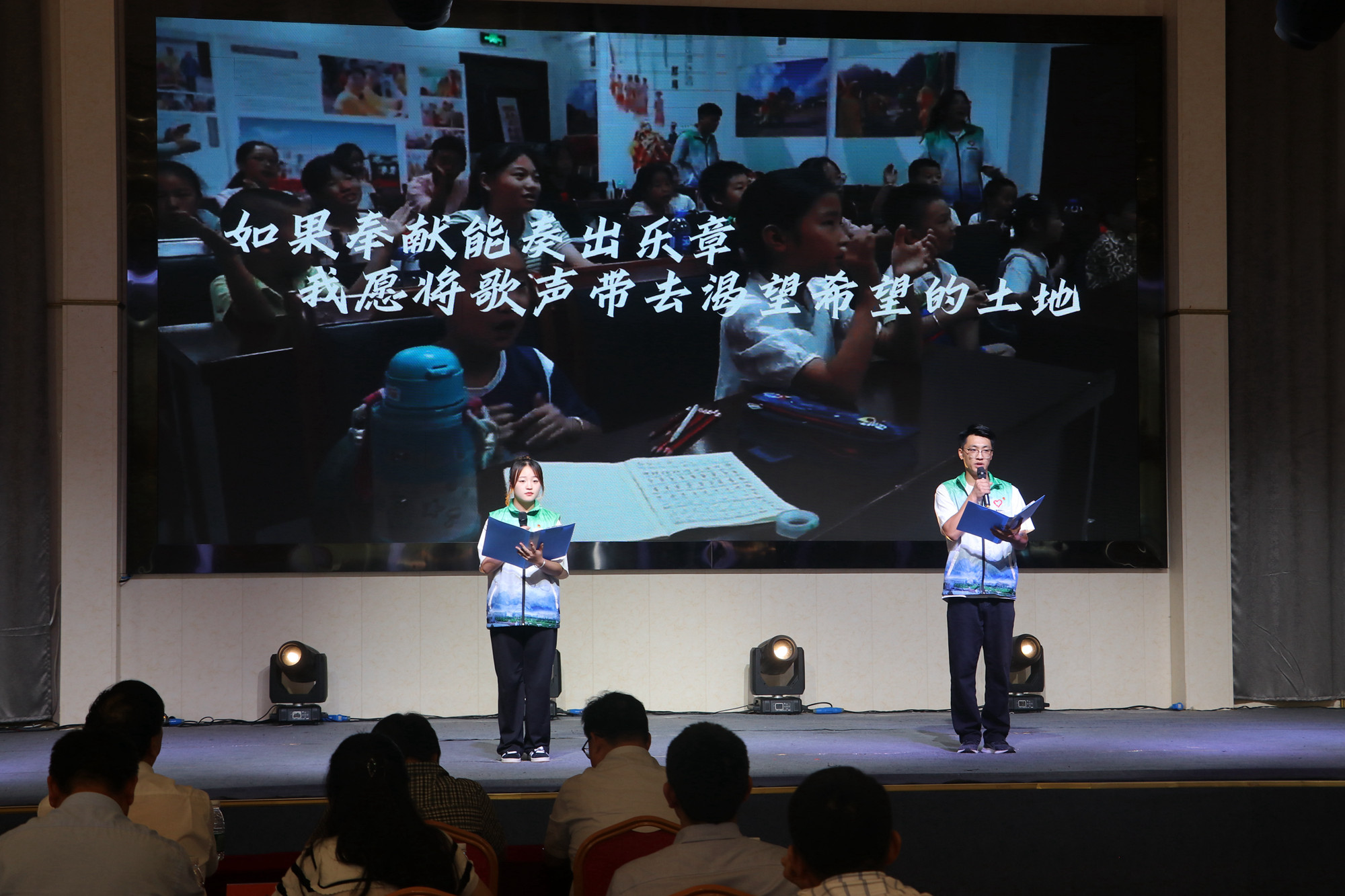 金山圆梦支教队的青年志愿者赵婧君和赵浩宇上台,分享了他们在偏远地区支教的酸甜苦辣;