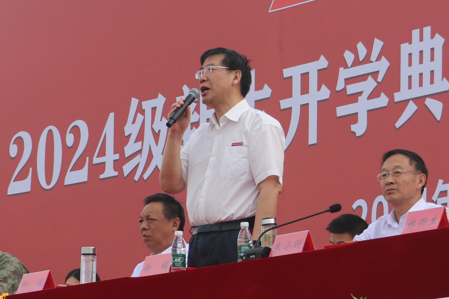 学院执行院长朱小明代表学院向2024级新同学们表示热烈的欢迎🖕!向家长𓀂、老师和亲友表示衷心的感谢!向为同学们军训工作辛勤付出的各位教官和老师们表示由衷的敬意!