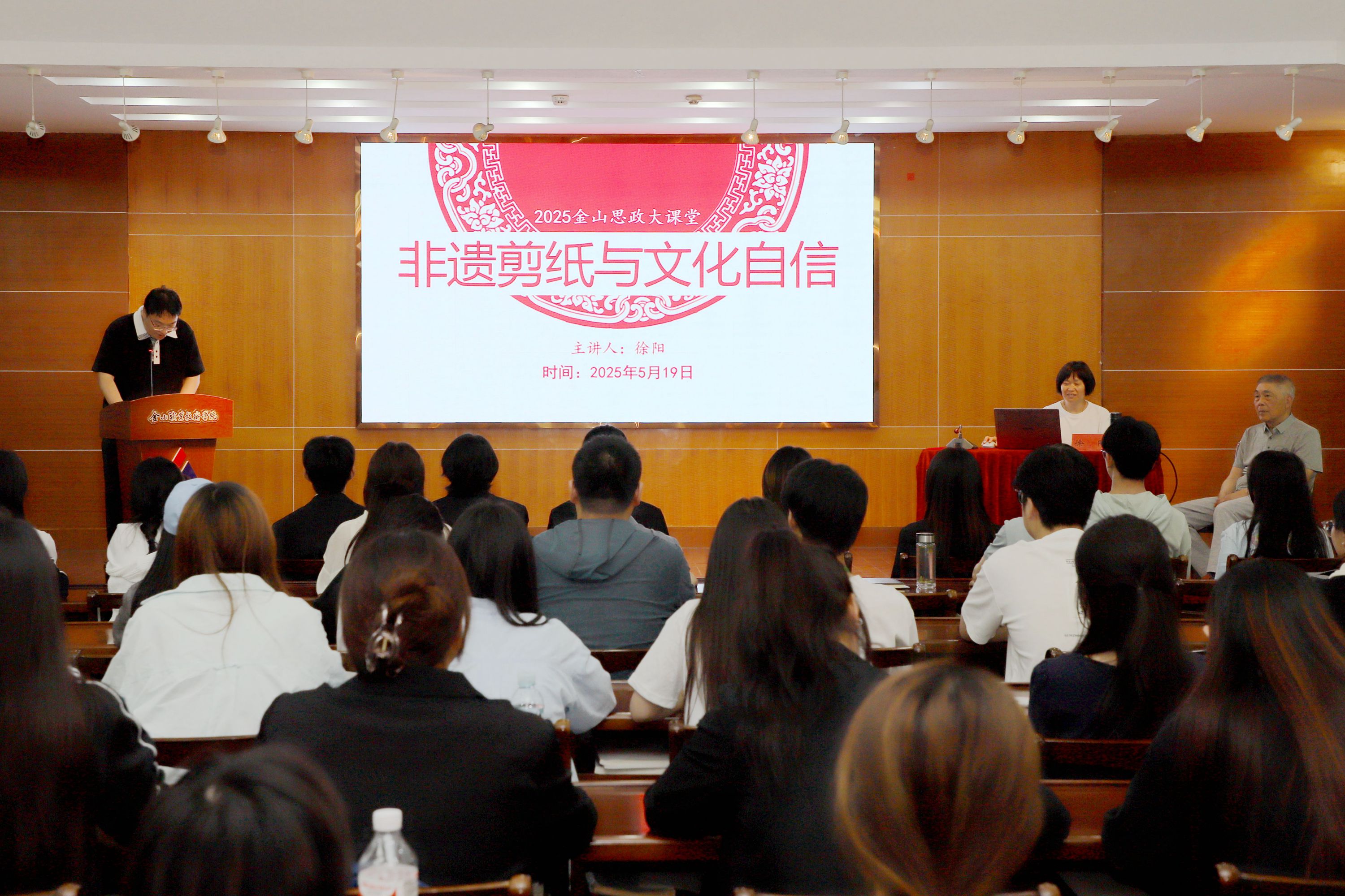 徐阳大师移步江声楼三楼会议室,为我校师生代表作题为《非遗剪纸与文化自信》的专题报告。他从一张红纸、一把剪刀的千年历史讲起,结合自身从学徒到国家级传承人的成长故事,诠释剪纸艺术中蕴含的“天人合一”“虚实相生”等中华哲学智慧。